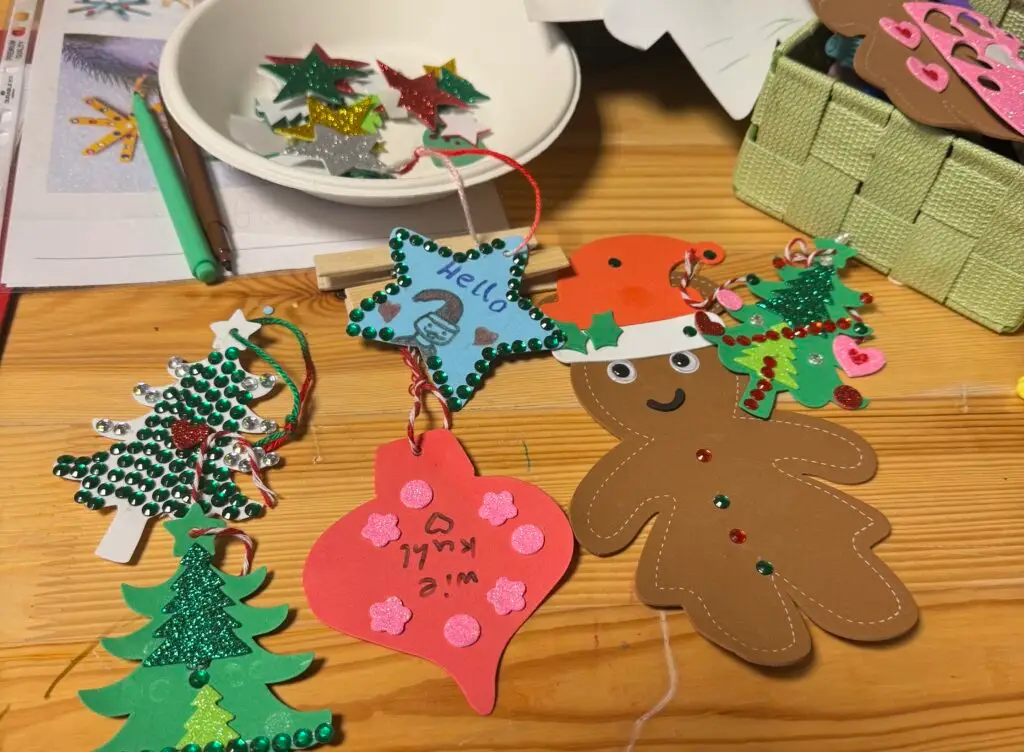Spaß beim Basteln hatten auch Aynul und ihr Bruder Omar, die spontan vom Spielen in der Siedlung in den Nachbarschaftstreff kamen. Sie bastelten nicht nur bunte Anhänger für den Baum, sondern auch gleich noch welche für zu Hause und wollten ihre kleinen Kunstwerke stolz ihren Eltern zeigen.
