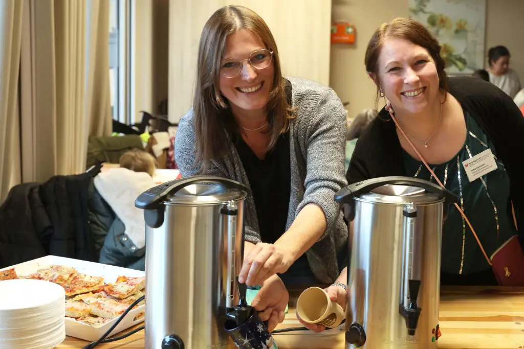 Beim Verteilen von Glühwein und Kinderpunsch kamen Julia Horsch und Silke Giertz vom Team Sozialarbeit ins Gespräch mit den Bewohnern. Insgesamt herrschte ein reger Austausch an den vollen Tischen und auch neue Nachbarn wurden herzlich aufgenommen. Zum Abend hin konnte man sich ein Stück Pizza, später auch gegen einen kleinen Obolus von einem Euro eine leckere Portion Currywurst holen. Diese Einnahmen kommen im nächsten Jahr dem Programm vom „Servicewohnen“ zugute.