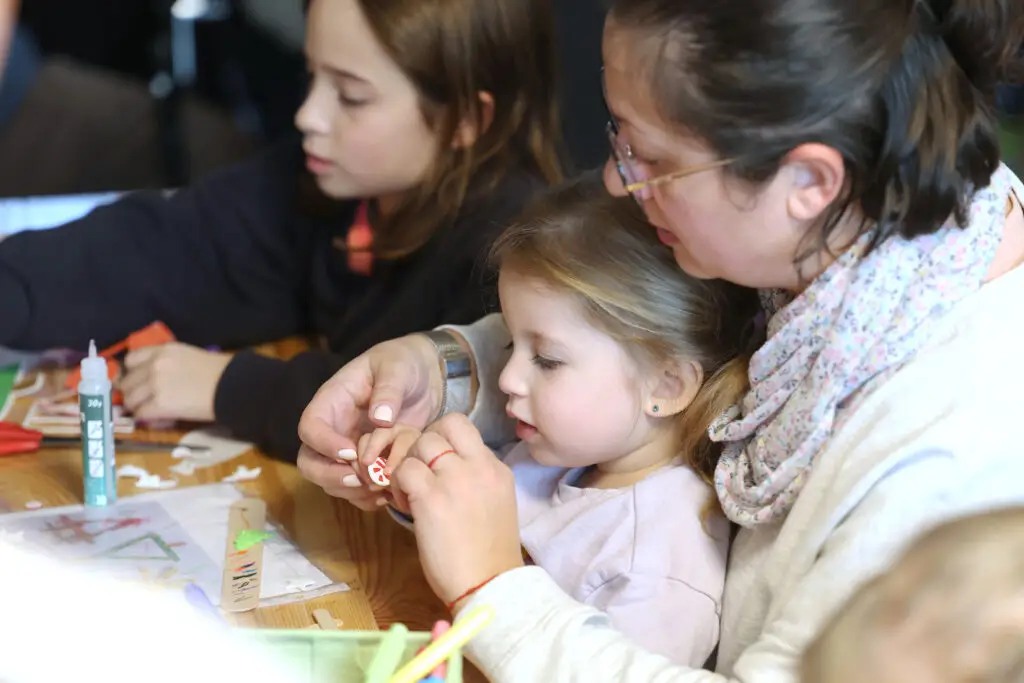 Ganz besonders eifrig ging es im Trockenraum zu: Hier bastelten Kinder jeden Alters, viele mit der Hilfe ihrer Eltern, wunderschöne Postkarten, die sie ihren Omas und Opas zum Fest schenken wollen. Das Material dafür hatte Barbara Rauh zur Verfügung gestellt. „Dann wird es den Kindern nicht langweilig und sie können das Selbstgebastelte mit nach Hause nehmen“, erklärte sie.