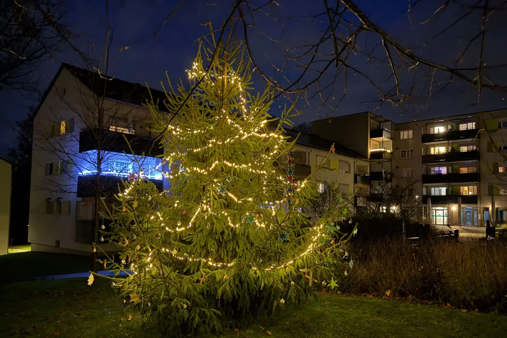 Zum Schluss wurde dann noch der auf der Wiese im Hof stehende große Weihnachtsbaum geschmückt. Er wird nun bis in den Januar eine heimelige Atmosphäre in die Siedlung bringen. Dank an der Stelle auch an das Team GaLa-Bau der SBV eG, das wieder dafür gesorgt hat, dass der große Baum sicher steht und weithin leuchtet!