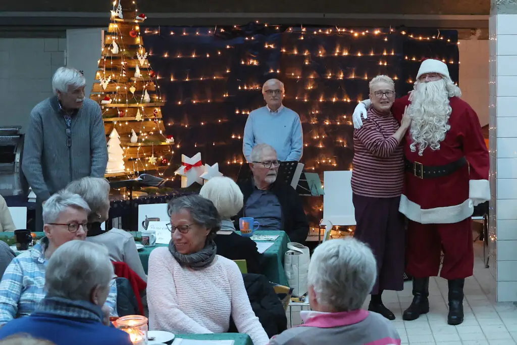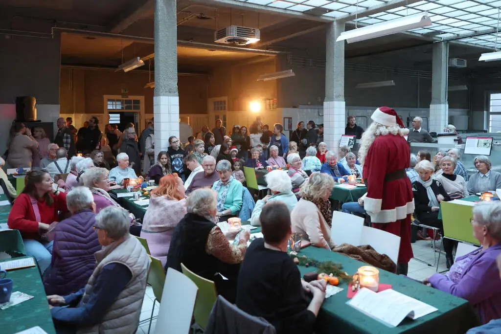 Und das Organisationsteam rund um Bert Rauh und Viola Mybes hatte sowohl die Krippe als auch den Holz-Weihnachtsbaum aufgestellt und die Tische wunderschön weihnachtlich geschmückt. Im Sinne der Nachhaltigkeit lagen auf allen Tischen auch Tütchen bereit, um die „essbare Deko“ Nüsse, Mandarinen, Äpfelchen und Schokolade und auch das Tannengrün am Ende mit nach Hause zu nehmen.