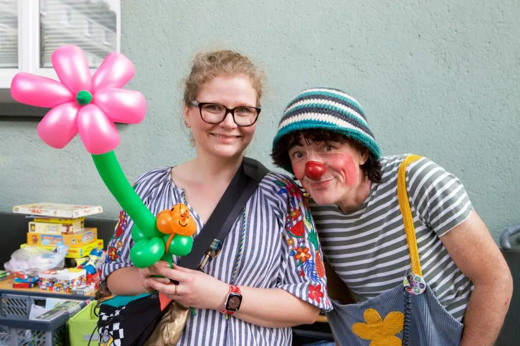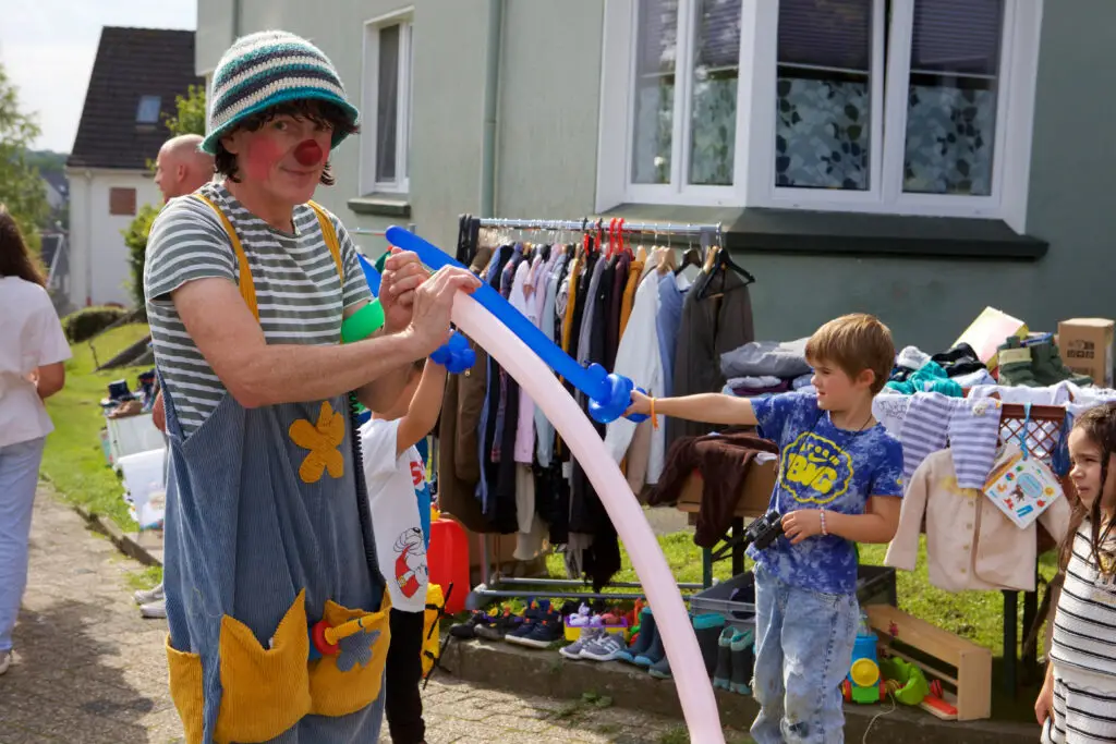 Bedanken möchte sich Marion Thiele beim Team Sozialarbeit der Spar- und Bauverein Solingen eG: „Wir haben mehrmals gesprochen und ich bekam viel Unterstützung, um das Ganze überhaupt auf die Beine zu stellen. Auch bei so grundlegenden Dingen wie der Anmeldung beim Ordnungsamt und der Absicherung durch eine Veranstaltungshaftpflichtversicherung standen mir Frau Horsch und Frau Giertz sehr hilfreich zur Seite. Ein besonderer Glücksfall war auch ihr Tipp, Clown Willy anzufragen – zu meiner Freude hatte er Zeit und sorgte mit seiner Ballonzauberei und Scherzen für eine ganz besondere Stimmung, die nicht nur die Kinder begeisterte. Toll war außerdem, dass eine Nachbarin Kinderschminken anbot. Ich selbst habe die Riesenseifenblasen beigesteuert. Vielleicht gelingt es uns im nächsten Jahr, das Angebot noch vielseitiger zu gestalten – die Idee darf wachsen!“