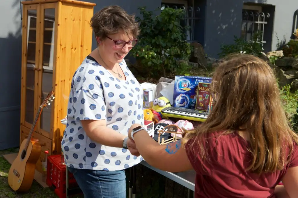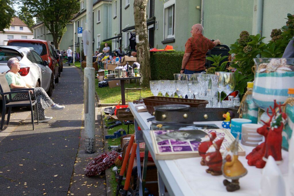 Mit Stühlen, Hockern, Tapeziertischen und „Kind und Kegel“ waren sie dabei – die Bewohner und Bewohnerinnen der Schillerstraße, Vereinsstraße, Kurze Straße und Margaretenstraße. Denn bei dem Markt ging es nicht nur ums Verkaufen und Kaufen, sondern auch um Begegnung und die gemeinsam verbrachte Zeit. Das war Marion Thiele besonders wichtig: „Ich wollte erreichen, dass sich alle eingeladen fühlen und möglichst viele mitmachen, in welcher Form auch immer, jeder nach seiner Façon und mit den Mitteln, die ihm oder ihr zur Verfügung stehen“, erklärt Marion Thiele.